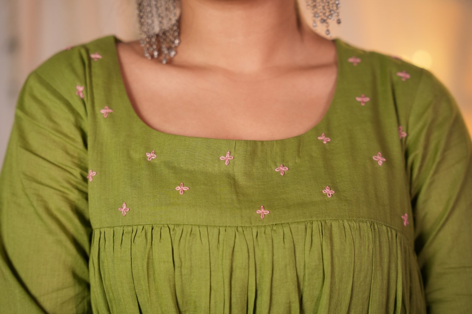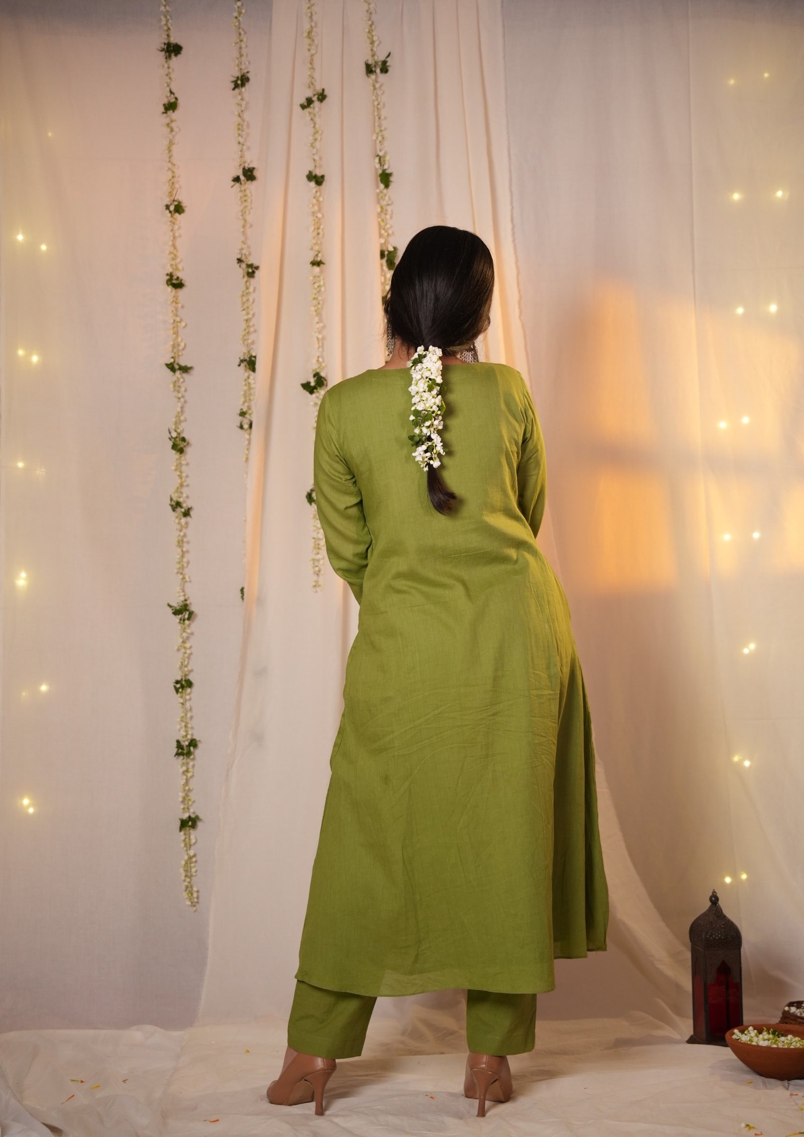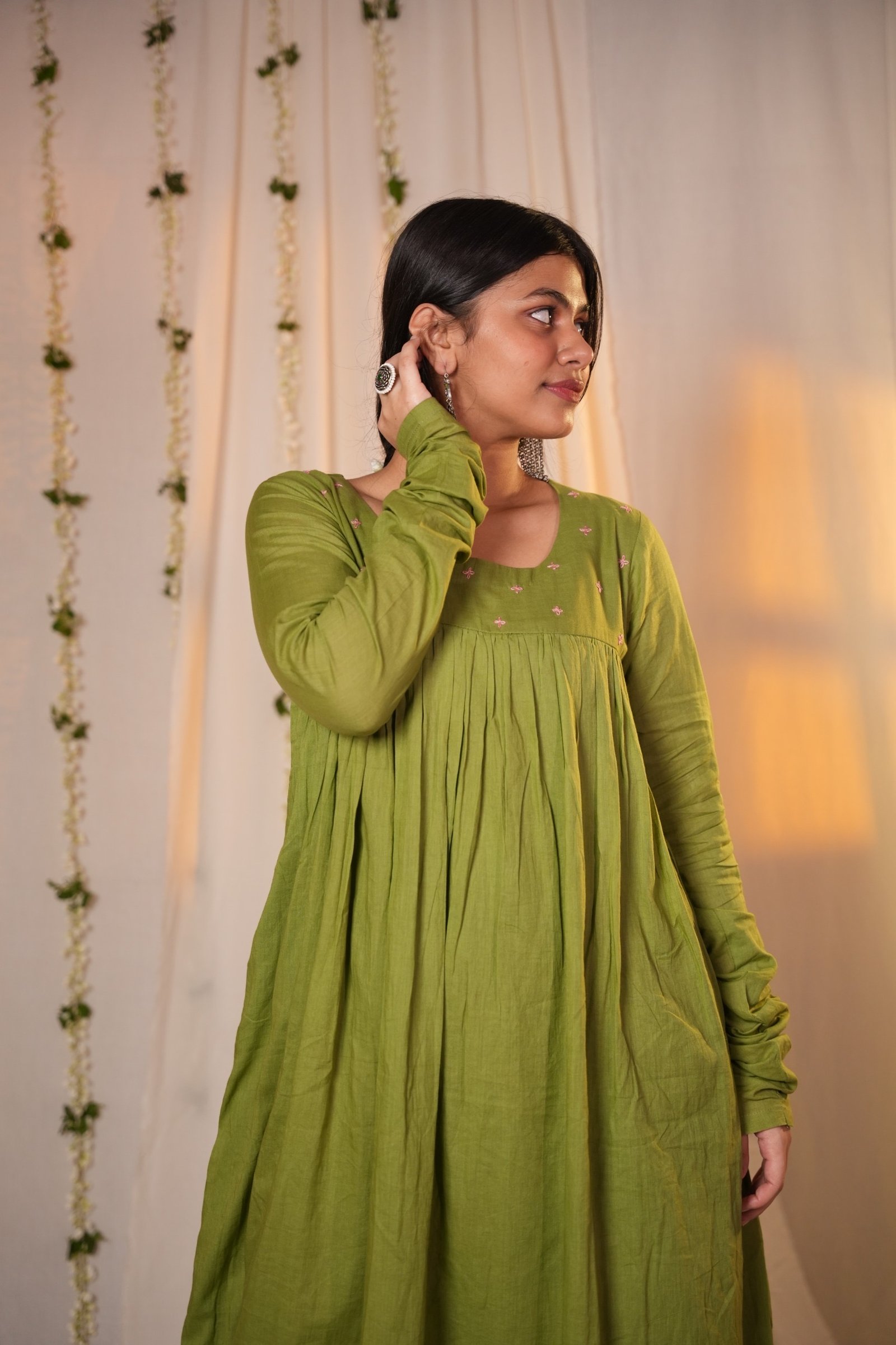 A fluid A-line kurta–pant set in a deep, earthy green, designed to move gently with the body. The neckline is adorned with delicate floral embroidery that adds softness to the structured silhouette. Crafted in breathable fabric, the kurta falls effortlessly while maintaining a refined presence. Paired with matching pants featuring a front belt and elasticated back, this set balances comfort with quiet sophistication.