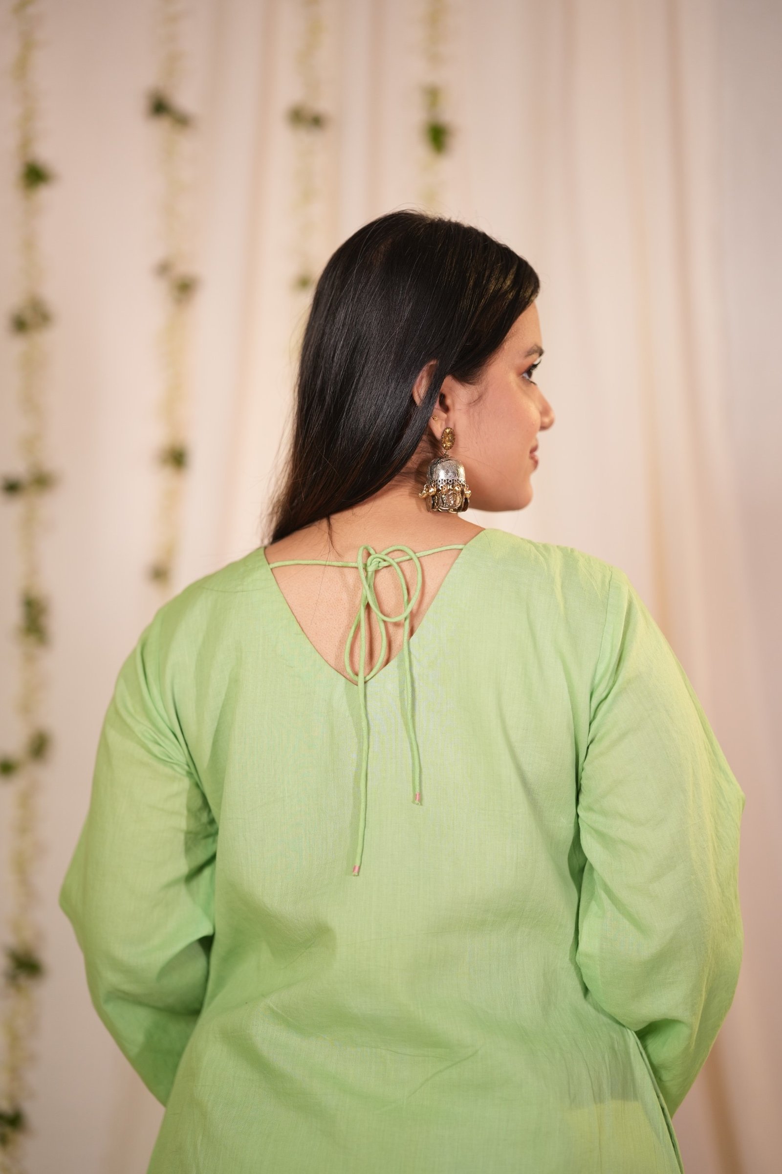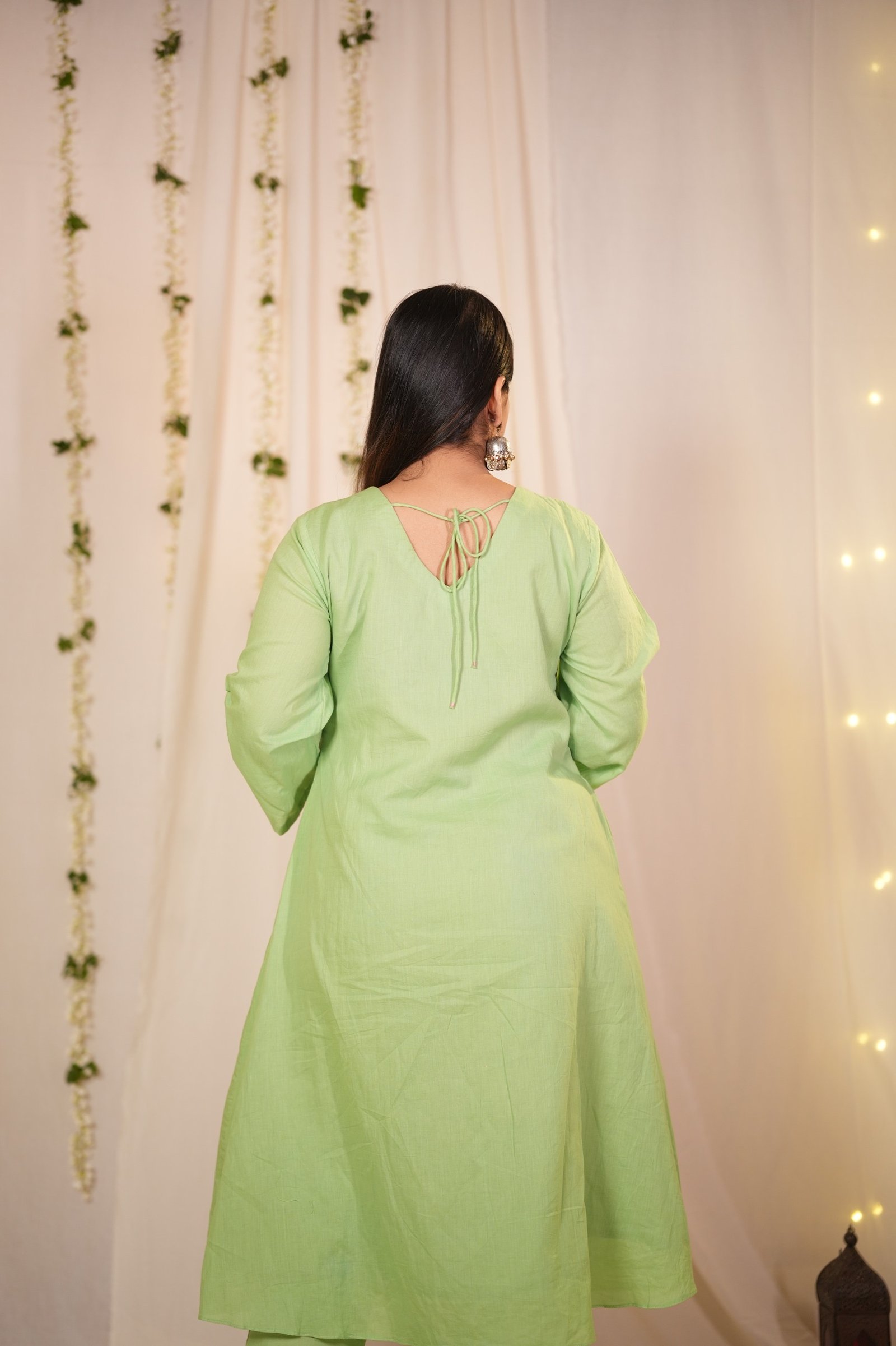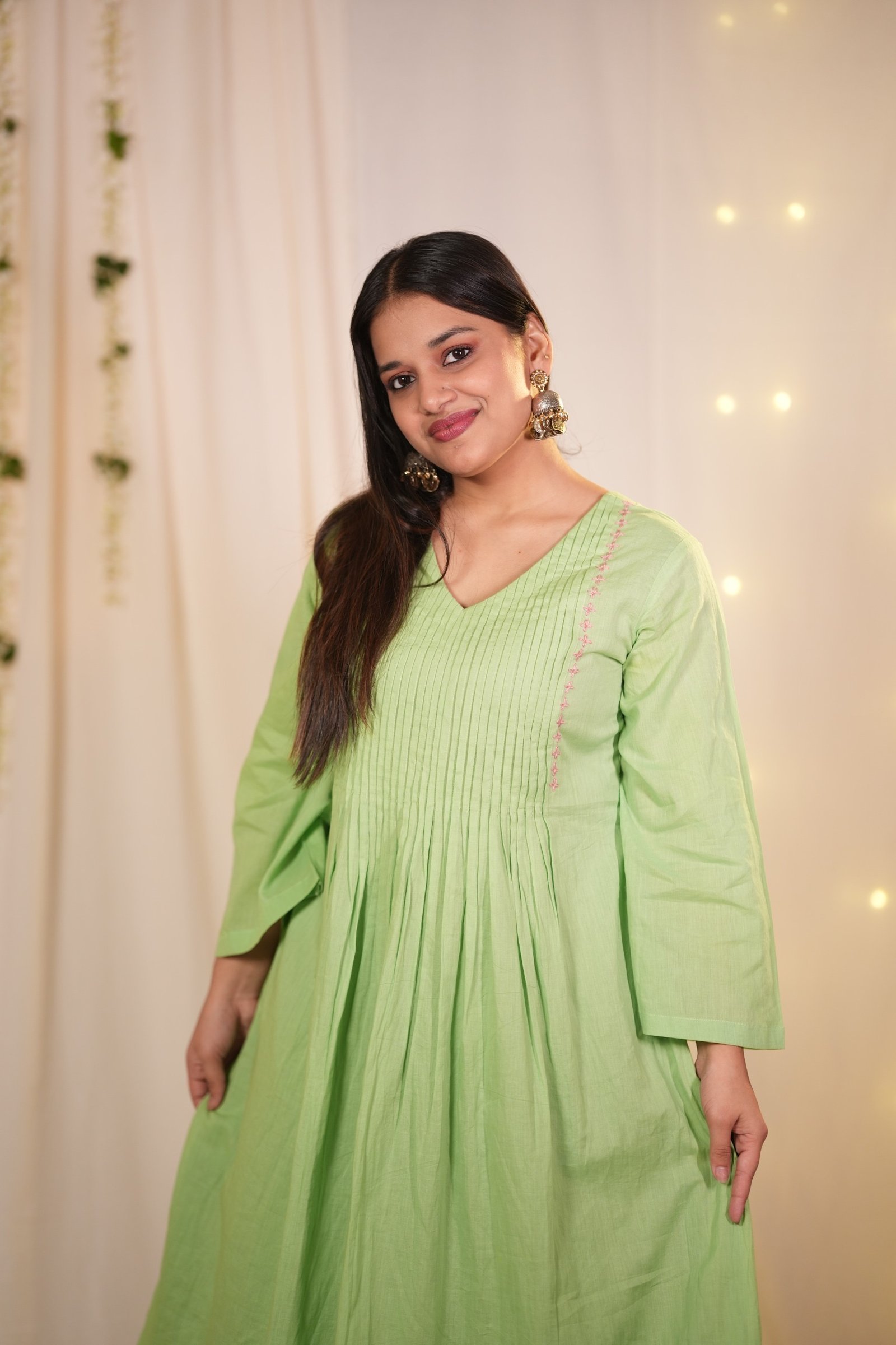 A fresh green A-line kurta–pant set featuring a softly pleated neckline, highlighted with embroidery on both sides of the pleats. The detailing adds depth while preserving the simplicity of the silhouette. Designed for those who appreciate craftsmanship in subtle forms.